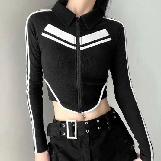 Striped V Waist Zip-Up Top